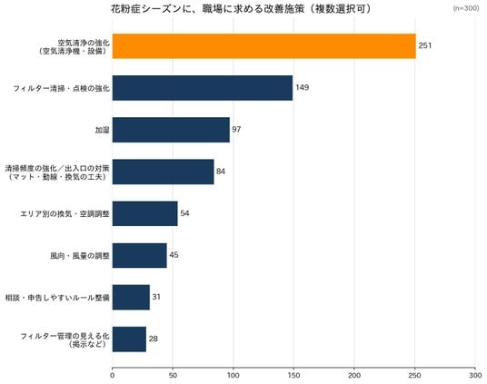 花粉シーズンに職場に求める改善施策としては、「空気清浄の強化(空気清浄機・設備)」が251人(83.7%)と圧倒的な首位。