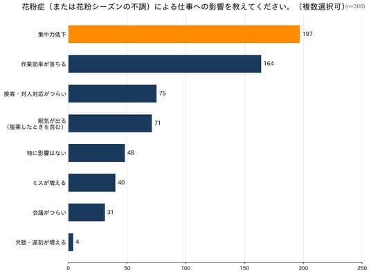 集中力低下が197人(65.7%)――花粉症が「仕事の質」を蝕んでいる