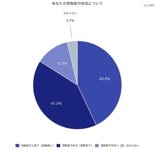 今回のアンケート回答者300名のうち「花粉症である(診断あり)」は41.0%、「花粉症だと思う(診断なし)」は43.0%にのぼり、合計84.0%が花粉症の症状を自覚していることがわかりました。正式な診断を受けていなくても自覚症状を持つ層が約4割を占めており、潜在的な花粉症人口の多さが浮き彫りになっています。