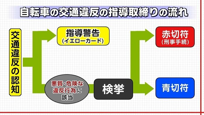 これまで、自転車による交通違反に対し、警察は注意・警告を示す「指導警告カード(イエローカード)」と、重大な違反として刑事手続きとなる「赤切符」の2種類で処理してきた。しかし、刑事手続きは警察と違反者の双方にとって時間的・手続き的な負担が大きいという課題があった。