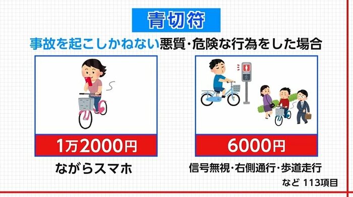 一方、青切符は、ながらスマホ、信号無視、右側通行など、事故につながりかねない悪質・危険な行為をした場合に交付される。違反項目は全部で113項目に上る。