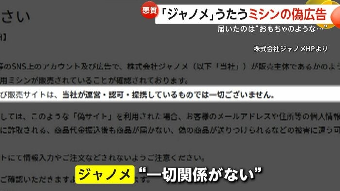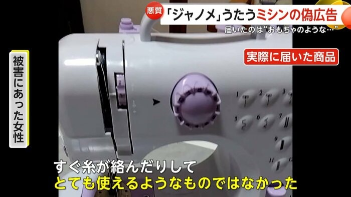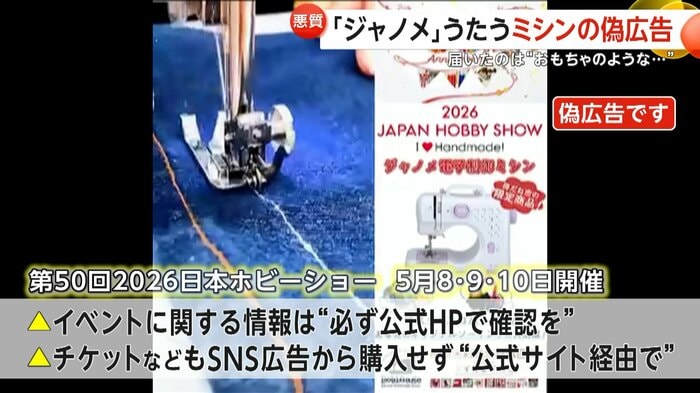 SNSに表示されたジャノメミシンの偽広告による被害が相次いでいる。日本最大級のハンドメイドイベントとのコラボ品と称し割引価格で購入させる手口で、届いた商品はおもちゃ同然のミシンだったという。3月は入園・入学準備でミシン需要が高まる時期で、業者がその時期を狙っているとみられている。