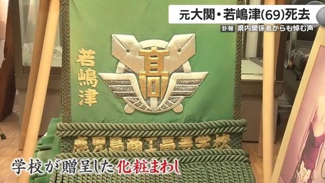 鹿児島市の樟南高校。かつて鹿児島商工高校と呼ばれていたこの学校が、若嶋津の母校だ。校内の資料室は野球部などさまざまな運動部の栄光の軌跡が並ぶが、部屋の奥に鎮座するのが、当時の校章があしらわれた緑色の化粧まわし。学校が若嶋津に寄贈したものだ。