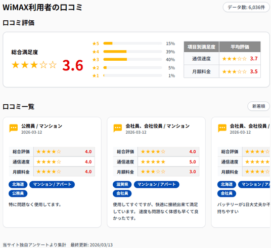 WiMAX比較.comでは、今回の「WiMAX利用実態白書 2026」で得られた知見を、調査レポートとして発信するだけでなく、実際のユーザー体験の改善にもつなげてまいります。その一環として、当社が独自に収集してきた口コミデータをもとに、利用者の総合満足度や通信速度・料金に対する評価、利用用途、自由記述コメントなどを記事内で確認できる口コミ機能を、主要ページに実装しました。これにより、ユーザーは料金やキャンペーンの比較だけでなく、実際の利用者の声を踏まえながら、自分に合ったWiMAXサービスをより具体的に判断できるようになります。