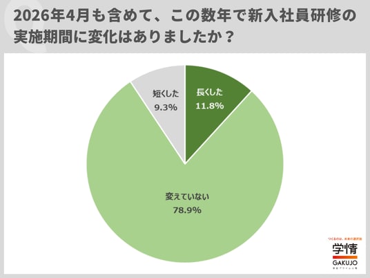 この数年で新入社員研修の実施期間は「変えていない」が8割近くで、大きな変化は見られませんでした。ただ、「長くした」が11.8%、「短くした」も9.3%ありました。