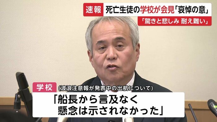 学校は会見で謝罪するとともに、波浪注意報が発表される中での出航について、「船長から言及なく、懸念は示されなかった」とし、「船長に判断を任せていた」と説明した。