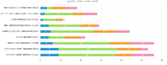 前述の質問で、AI生成マンガに「違和感がある」と答えた人に理由を尋ねたところ、「会話のテンポが人間の会話として不自然」と「キャラクターの感情と表情が合っていない」の二つの回答が共に56票と最も多い結果となりました。