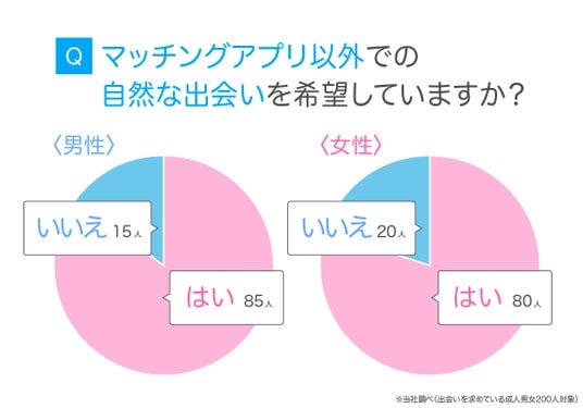 成人男女200人に「マッチングアプリ以外での自然な出会いを希望しているか」を尋ねたところ、「はい」165人(82.50%)となりました。男女別でも8割を超え、「自然な出会い」へのニーズが広く存在していることが分かります。