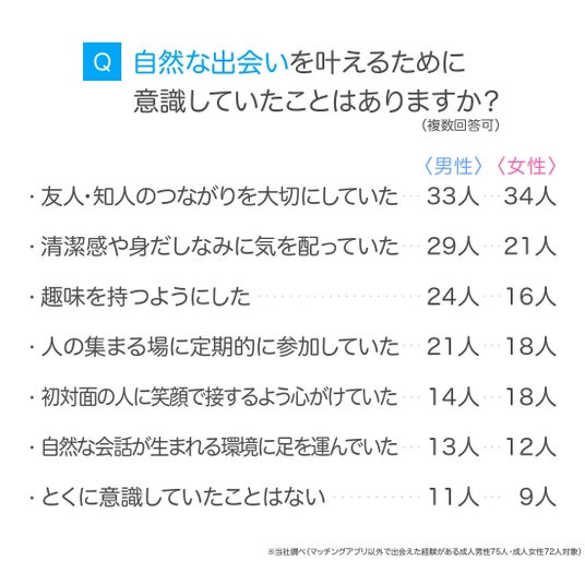 続いて、マッチングアプリ以外で出会えた経験がある男女147人に、「自然な出会いを叶えるために意識していたこと」を尋ねました(複数回答可)。