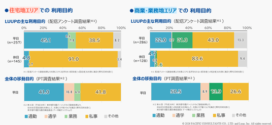 調査の結果、マイクロモビリティのシェアリングサービス「LUUP」は、短距離・短時間の利用が主流であることがわかりました。主な利用目的について、特に住宅地では通勤‧通学での利用は全体の約4割を占めており、商業・業務地では仕事中の移動、買い物、食事、観光・娯楽など、さまざまなシーンで活用されるなど、人々の日常における必需性の高い移動に役立っていることが読み取れます。さらに、ほとんどのエリアが駅勢圏やバス圏にカバーされる都市部である一方で、約2割が公共交通での移動が不便な地点間で利用されているなど、公共交通機関が不便な地点・時間を補完する役割があることがわかりました。