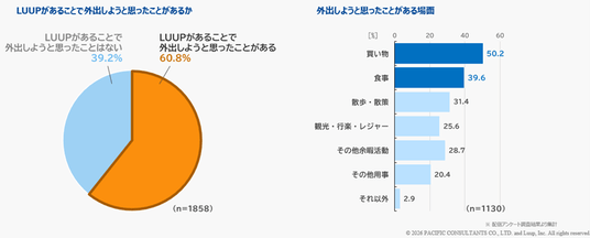 加えて、移動に際し「LUUPを選んだ理由」として、「時間を自由に使えるから」の回答が約5割、「LUUPがあることで外出しようと思ったことがある」利用者は約6割、「LUUPのポートが近くにあることで目的地を決めたことがある」利用者は約4割にのぼるなど、マイクロモビリティのポート設置が、施設の集客圏拡大にも寄与する可能性があることが明らかになりました。