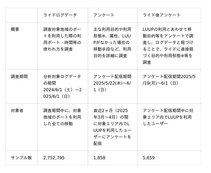 そこで今回の共同調査では、マイクロモビリティのシェアリングサービスの一つである「LUUP」を対象に、都市部の新たな交通手段として日頃どのように利用されているか、都市部の移動課題にどのように貢献しているのかについて、調査・分析を行いました。