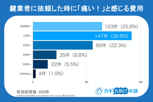 続いて、鍵を紛失した際の出費として「正直、これは痛い!」と感じる金額のボーダーラインを聞いたところ、「1万円~(36.8%)」が最も多く、「5,000円~(25.8%)」「2万円~(22.3%)」と続いています。