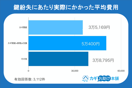 「カギお助け本舗」における2025年4月から12月までの施工実績(全3,112件)を調査したところ、鍵紛失に伴う費用の平均は3万6,296円という結果になりました。