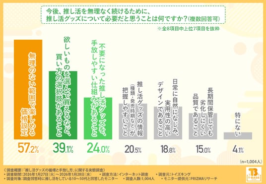 『無理のない範囲で楽しめる価格設定(57.2%)』と回答した方が最も多く、『欲しいものを選んで買えるなど、買い方の選択肢があること(39.1%)』『不要になった推し活グッズを、手放しやすい仕組みがあること(24.0%)』と続きました。