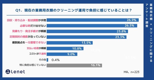 株式会社ホワイトプラス(本社 東京都品川区、代表取締役社長 井下孝之、以下「当社」)が提供する宅配クリーニング「Lenet(以下、リネット)」は、自社の職場で用いる業務用衣類(作業着・制服・ユニフォーム等)の洗濯・クリーニングの発注・運用に関与した経験を持つビジネスパーソン223名を対象に、運用負担や従業員への影響、経営リスク認識、体制見直し意向に関する調査を実施しました。