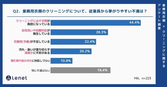 次に、業務用衣類のクリーニングについて、従業員から挙がりやすい不満を尋ねました。その結果、「特に不満はない」と回答した企業は18.4%にとどまり、81.6%の企業で何らかの従業員不満が発生していることが明らかになりました。