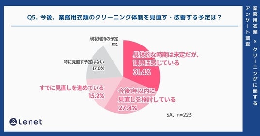 最後に、今後の業務用衣類のクリーニング体制について、見直しや改善の予定があるかを尋ねました。その結果、「具体的な時期は未定だが、課題は感じている」が最も多く31.4%。次いで「今後1年以内に見直しを検討している」27.4%、「すでに見直しを進めている」15.2%と続きました。