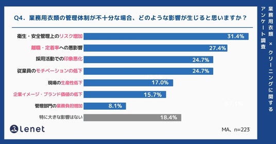 また、「現場の生産性低下(着替え不足・対応遅れ等)」17.0%、「企業イメージ・ブランド価値の低下」15.7%といった回答も見られ、業務用衣類の管理体制は現場運営から企業ブランドまで幅広い領域に影響を及ぼす可能性が示されました。