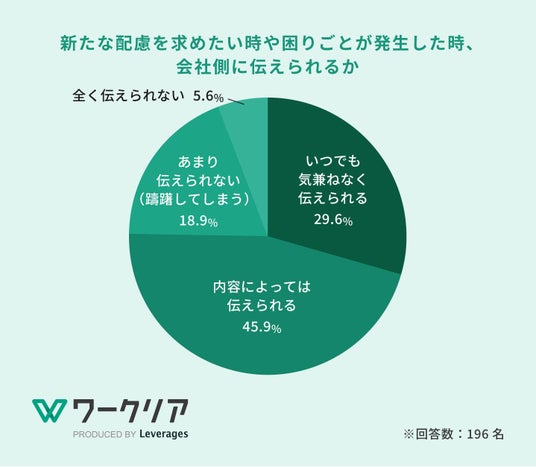 新たな配慮を求めたい時や困りごとが発生した場合について、約8割は会社側に「伝えられる(75.5%)*5」と回答した一方で、未だ約4人に1人は「躊躇してしまう(18.9%)」「伝えられない(5.6%)」と回答しました。