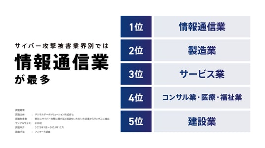 2025年におけるサイバー攻撃の被害が多かった業界として、情報通信業、製造業、サービス業が挙げられます。当社が2024年に公表した調査レポートと比較し、上位3位の順番は変わらず、前回6位だった医療・福祉業が4位にランクインしました。