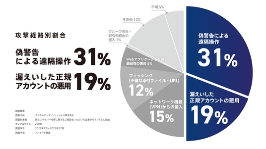4. 攻撃経路別では「偽警告による遠隔操作」が31%、「漏えいした正規アカウントの悪用」が19%を占め、ダークウェブに流出した認証情報が悪用されるケースが増加傾向にある。