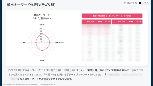 「料理・味」に関するポジティブキーワードTOP10では、「◯◯◯◯」「◯◯◯」などのキーワードが上位にランクインしており、お客様の評価ポイントであることが伺えます。