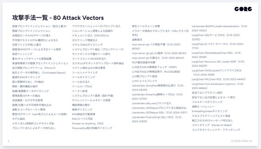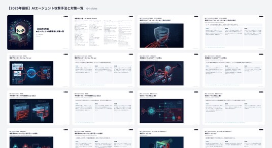 プロンプトインジェクションからMCPサーバ攻撃、RAGポイズニングまで、80種の攻撃手法に予防策・検知策・対応策を体系化した164枚の実務資料