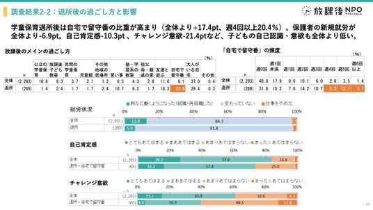 豊かな放課後の居場所の選択肢が地域にある状態を国・自治体・地域・民間団体が連携してつくっていく必要がある。今回の調査では、公立の学童保育の退所時期は小学3年生が最多である一方、小学1年生の4~6月にも約1割の退所が発生していることが明らかになりました。退所理由としては「子どもが行きたがらなくなった」が多く、その背景には、活動内容のミスマッチや友達の退所、制度上の制約などが挙げられます。また、退所後は地域の居場所に移行するのではなく、自宅で留守番をする割合が増えている実態も確認されました。さらに、放課後を主に「自宅で留守番」で過ごす子どもは、自己肯定感やチャレンジ意欲が相対的に低い傾向がみられ、保護者の満足度や安心感も低い傾向が見られました。一方で、「行きたい・好き/ほっとできる」と感じられる居場所で過ごしている子どもほど、自己肯定感やチャレンジ意欲、将来への希望が高い傾向にあり、放課後の居場所の質が子どもの意欲や自己認識に影響している可能性が示唆されました。