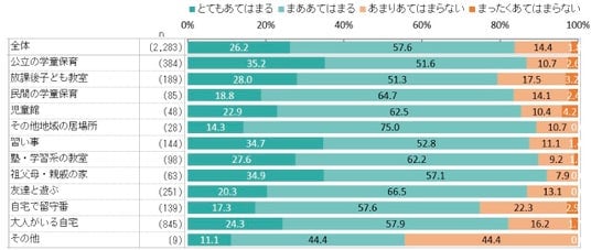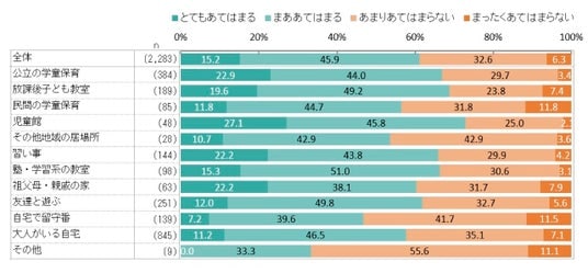 子どもの自己肯定感(自分のことが好きだ)について、全体では83.8%が肯定回答(とてもあてはまる+まああてはまる)。メインの放課後の過ごし方別にみると、「祖父母・親戚の家」が最も高く92.1%、次に「塾・学習系の教室」が89.8%となっており、「放課後子ども教室」(79.4%)と「自宅で留守番」(74.8%)が全体を下回っています。