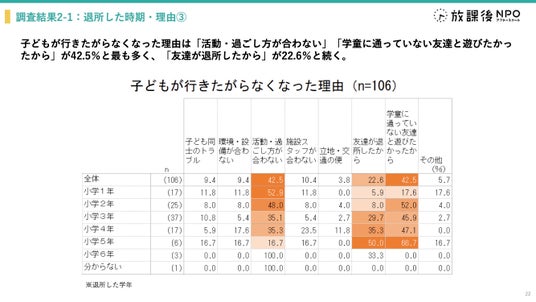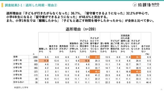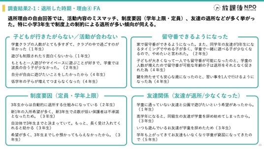 1.公立の学童保育退所時期は小学3年生が最多(32.9%)、1年生の4-6月にも1割程度の退所が発生。「子どもが行きたがらなくなった」が最大の理由。活動内容・音環境・選択性に改善余地があり、過ごし方の“質”が伴わなければ安定的な居場所として機能しにくい。併せて、定員拡充・学年上限の運用改善が必要。