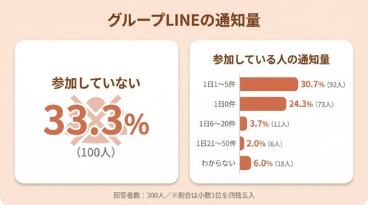 ・グループLINEの通知は参加していない33.3%(100人)。参加者でも1日0~5件が中心