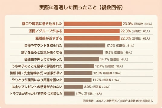 実際に遭遇したこと(困ったこと)を複数選択で聞くと、トラブルは直接の揉め事だけでなく、関係性の空気や立ち位置に起因するものが目立ちました。