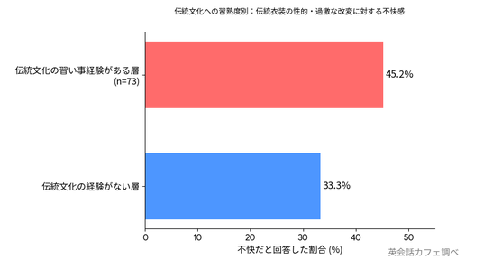 一方で、伝統文化に関わる経験を持つ層や女性層では、衣装の性的改造や宗教的モチーフの扱いなど、「本来の文脈や意味を無視した利用」に対してより強い不快感を示す傾向が見られました。