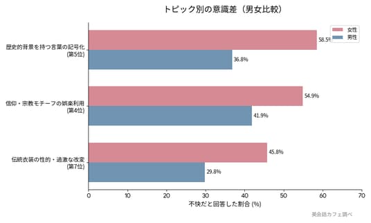 「伝統衣装の性的・過激な改造」や「歴史・宗教的モチーフの利用」において、女性のほうが男性よりも不快感が高い傾向にあります。