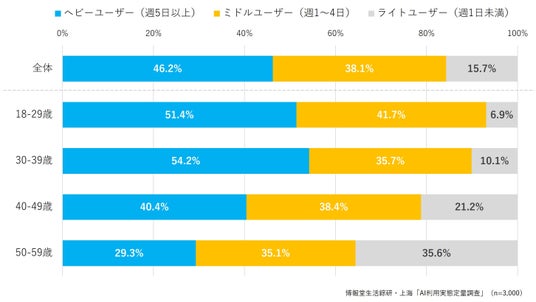 - AIを利用している人に利用頻度をきいたところ、「週5日以上利用する」と回答したヘビーユーザーが46.2%に達し、ミドルユーザー(週1~4日利用)の38.1%と合わせると、AI利用者のうちの約85%が週に1日以上利用。特に30代ではヘビーユーザーが54.2%と最も多く、仕事や育児などで忙しい日々の中、AIを活用することで時間を効率的に活用しているようです。(データ2)
