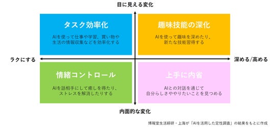 AI利用者へのインタビュー調査から、AI利用の主な目的を「タスク効率化」「趣味技能の深化」「情緒コントロール」「内省」の4つに分類。現在は「タスクの効率化」と「趣味技能の深化」のための活用が主流だが、今後は「情緒コントロール」や「内省」を目的とした活用も広がっていくとみられる。