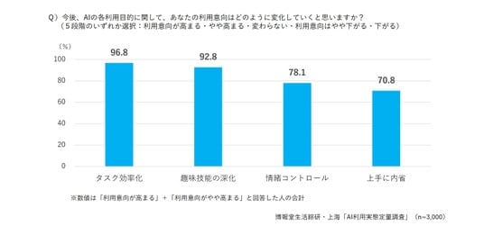 - 各目的に対し、今後の利用意向を5段階できいたところ、「タスク効率化」(96.8%)や「趣味技能の進化」(92.8%)のために利用したい(「利用意向が高まる」+「やや高まる」)と回答した人は9割超に。また、AI活用を通じて癒しを得たり、ストレスを解消する「情緒コントロール」(78.1%)や、AIとの対話を通じ自分らしさややりたいことをみつめる「内省」(70.8%)のために利用したいという人も7割を超えました。AI利用の目的が、精神的な充足や自己探求といった内面的な領域へと広がっていく兆しがみられます。(データ5)
