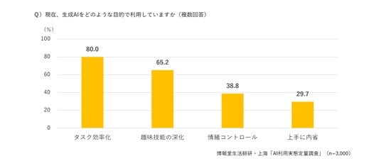 - AI利用者に、各目的のために現在AIをどの程度活用しているのかを複数回答できいたところ、「タスク効率化」が80.0%と最も高く、次いで「趣味技能の深化」が65.2%となりました。(データ