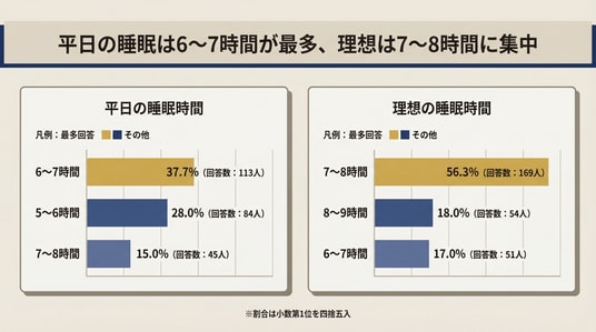 睡眠300人調査:89.3%(268人)が理想とのギャップを実感――平日は6~7時間37.7%(113人)が最多も、理想は7~8時間56.3%(169人)。寝る前はスマホ利用75.0%(225人)