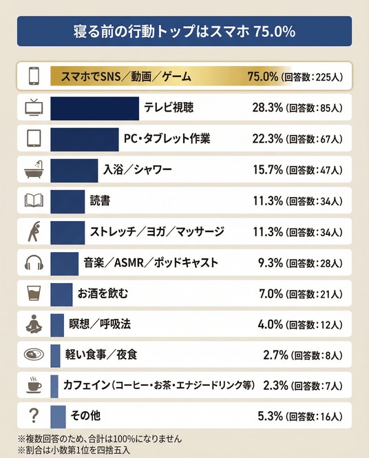 寝る前にしていること(複数回答)では、スマホでSNS/動画/ゲームが75.0%(225人)で最多。次いでテレビ視聴28.3%(85人)、PC・タブレット作業22.3%(67人)でした。