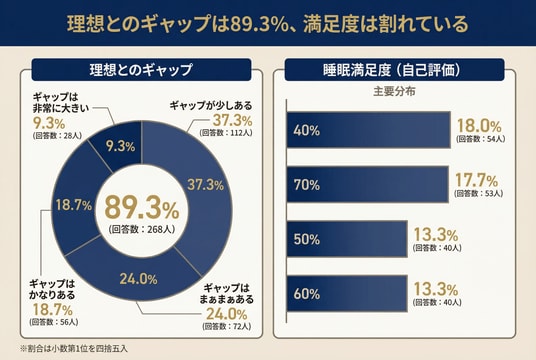 睡眠の満足度を自己評価で聞いたところ、70%以上の満足寄りは37.0%(111人)にとどまり、約9割が理想の睡眠とのギャップを感じていることが分かりました。