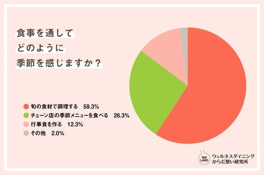 1位「旬の食材で調理する」(59.3%)、2位「チェーン店の季節メニューを食べる」(26.3%)、3位「行事食を作る」(12.3%)と続きました。