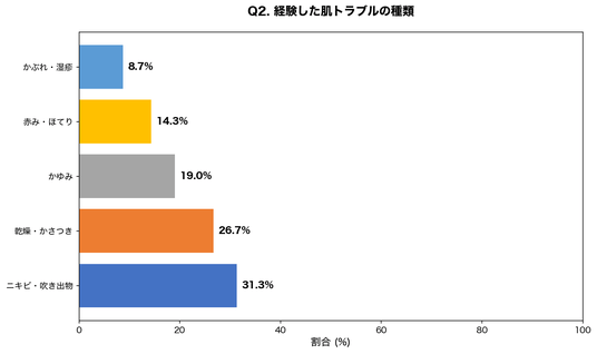 ニキビ・吹き出物が最多となり、マスク内の蒸れによる細菌繁殖が主要因と考えられます。乾燥・かさつきも26.7%と多く、マスク着脱時の急激な湿度変化が肌のバリア機能を低下させていることがうかがえます。