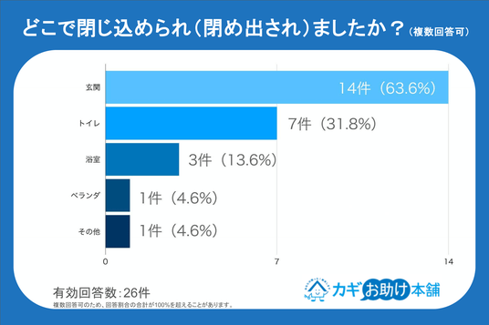 発生場所について詳しくみると、「玄関(63.6%)」が最多で、「トイレ(31.8%)」や「浴室(13.6%)」といった室内でのトラブルも目立ちます。