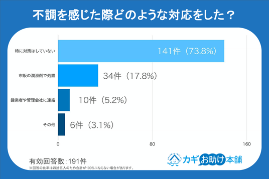 鍵の動作に違和感を覚えた際、どのような対応を取ったかを調査したところ、「特に対策はしていない」という回答が73.8%と圧倒的多数を占めました。