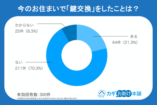 「今のお住まいで鍵交換をしたことがあるか」を聞いたところ、「ない(70.3%)」という回答が圧倒的多数を占めました。