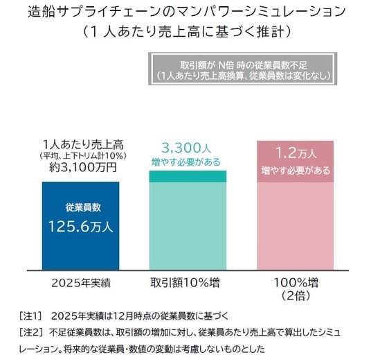 この結果、現状より造船向けの受注(取引)が1割増加した場合、受注額を消化するためにサプライチェーン全体で最大3300人が新たに必要となることが分かった。2024年度比で受注が2倍になると、単純試算で最大1.2万人分の従業員確保が求められる試算となる。従業員数を増やさずに受注増に対応する場合、1人あたりの売上高ベース(生産性)では1割増で平均0.1%、2倍で3.9%改善する必要がある。