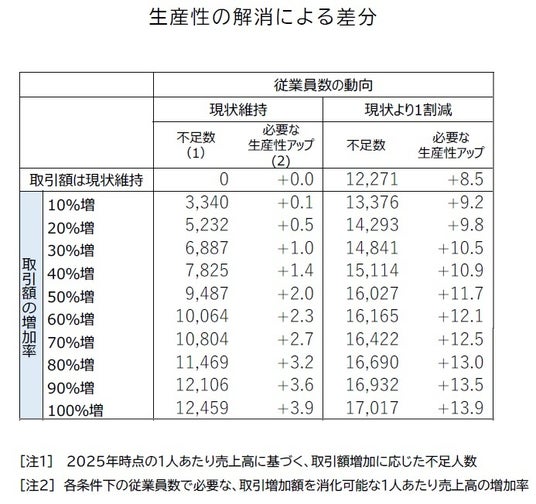 なお、少子高齢化が今後も進み、就業者を確保できないことで現状より従業員数が1割減少した状態では、最大で計1.7万人が不足する試算となった。従業員数を増やさずに対応する場合、受注1割増で9.2%、2倍で13.9%の生産性アップが必要となる。