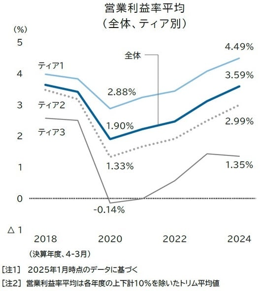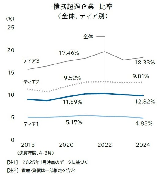 また、ティア2における倒産(経営破綻)のリスクが高まる「債務超過(自己資本がマイナス)」の割合は、サプライチェーン全体で2024年度に12.82%となった。営業利益面では改善傾向にあるものの、設備更新など設備投資を進めたことで借り入れ負担が増したことも要因とみられる。
